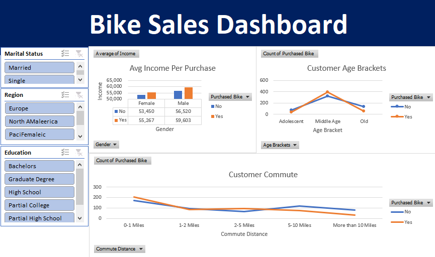Created a dashboard in Excel to analyze bike sales data from different customer segments and regions.
