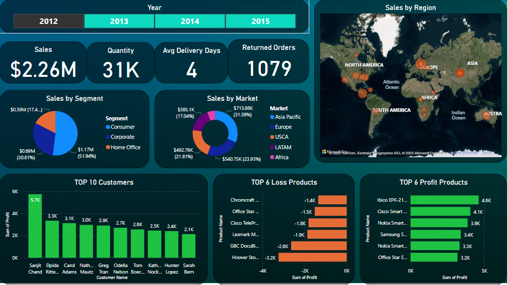 Discovered the best selling regions, the sales by segment and market, the top profitable and loss products, and the top 10 customers.